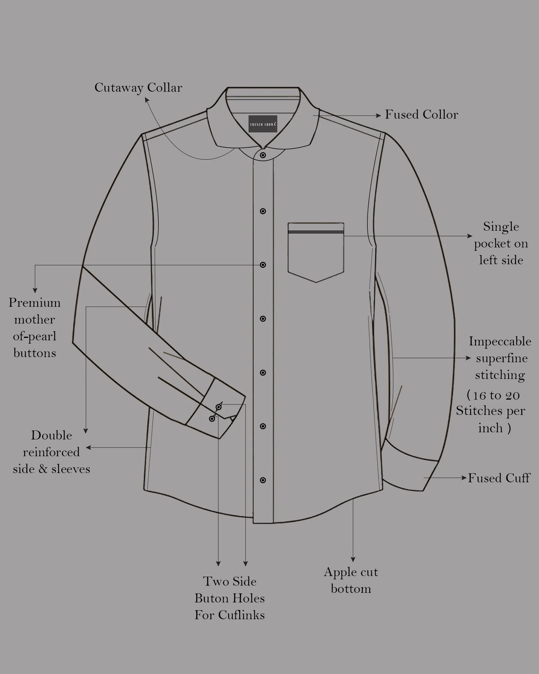 Fused collar and cuffs, collar stand and flat felled side seams provide structure and stability to all our shirts.