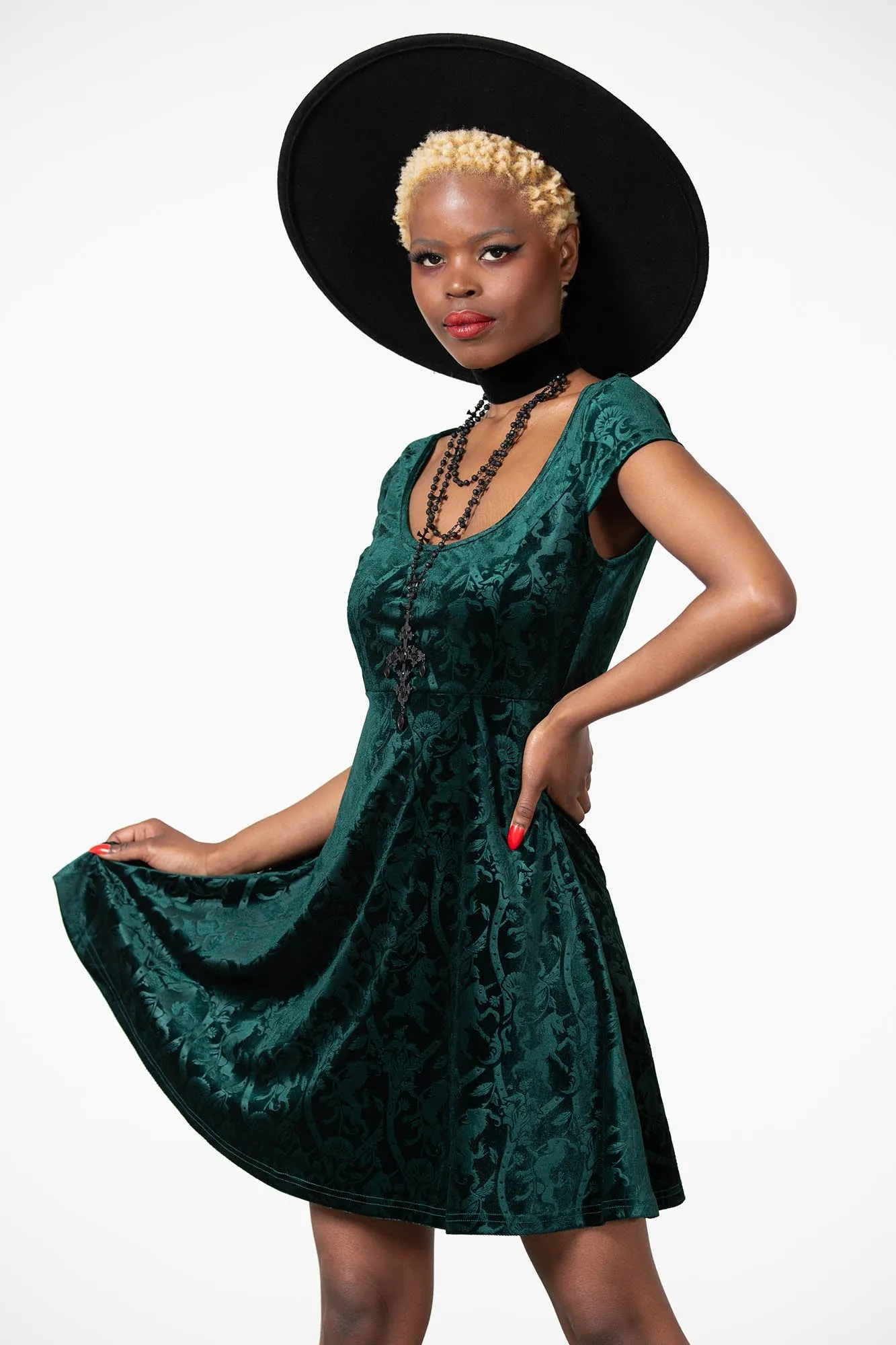 DEVILRY.- Soft touch, stretch velvet.- Custom made embossed print. - Cap sleeves- Scoop neckline.- Skater silhouette.- Fitted.Model is 5ft 4 and wears a size XS.with KILLSTAR branding, 93% Polyester 7% Elastane.